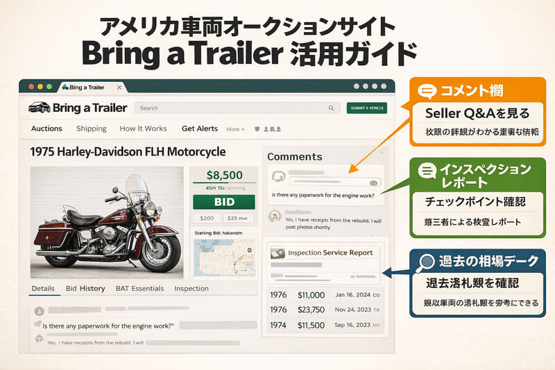 この記事では、Bring a Trailerとはどのようなサイトなのか、eBay Motorsとの違い、BaTでハーレーを落札するための具体的な方法、コメント欄の活用術、信頼できるセラーの見極め方、そして落札後の輸入手続きまで、アメリカからのハーレー個人輸入を成功させるための実践的な情報を詳しく解説します。