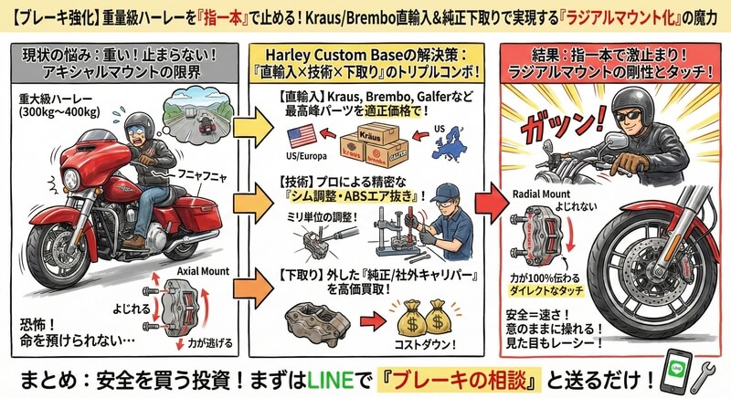 【ブレーキ強化】重量級ハーレーを「指一本」で止める!KrausやBrembo直輸入&純正下取りで実現する「ラジアルマウント化」の魔力