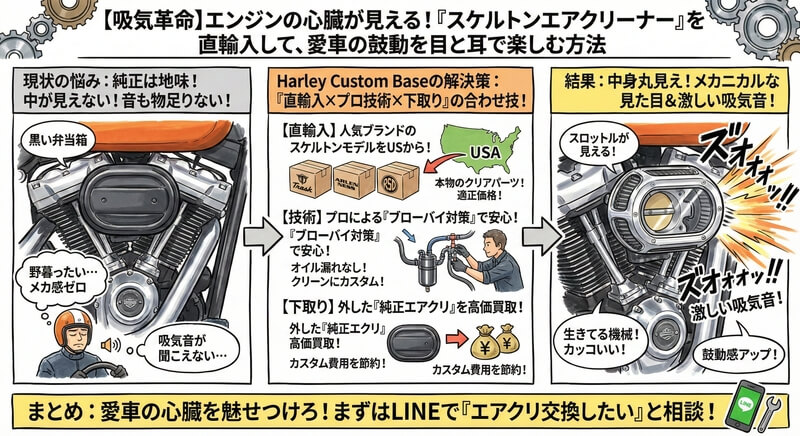 純正エアクリーナーの課題 野暮ったいデザインと機能の限界 ハーレーダビッドソンの右サイドに鎮座する純正エアクリーナー。機能的には十分な役割を果たしていますが、そのデザインは「黒いプラスチックの箱」といった印象で、カスタムバイクとしての魅力... -