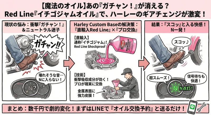 【魔法のオイル】あの「ガチャン!」という衝撃が消える?「Red Line」のイチゴジャムオイルで、ハーレーのギアチェンジが激変する