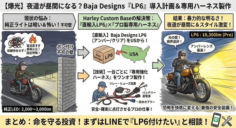 【爆光】夜道が昼間になる?ハーレーのヘッドライトをBaja Designs「LP6」に変えて、暗闇への恐怖とサヨナラする方法