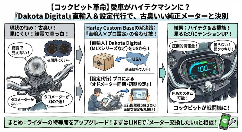ハーレー純正メーターの課題 結露や視認性の問題 ハーレーダビッドソンの純正アナログメーターは、クラシックなデザインが魅力的で、伝統的な雰囲気を持っています。しかし、長年の使用で多くのオーナーが抱える悩みがあります。 「雨上がりや冬の朝、メー... -