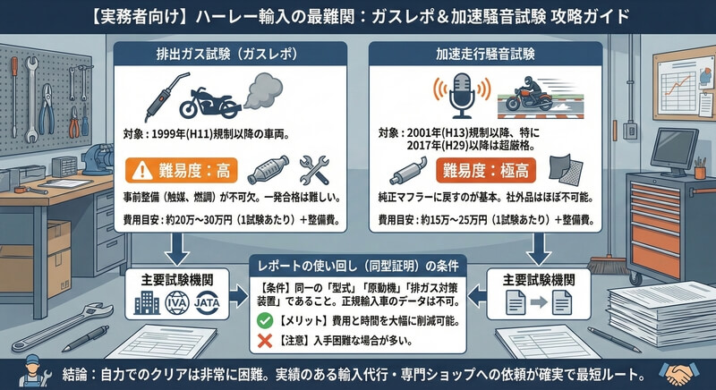 排ガス試験(ガスレポ)と加速騒音試験の取得方法と費用|輸入ハーレー登録で詰まらないための完全ガイド