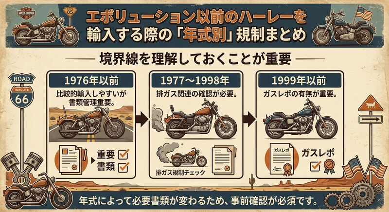 この記事では、特に重要な「1976年以前」「1977〜1998年」「1999年以前」という区切りを中心に、パン・ショベル・エボを輸入する際に知っておくべき規制の知識をわかりやすく解説します。