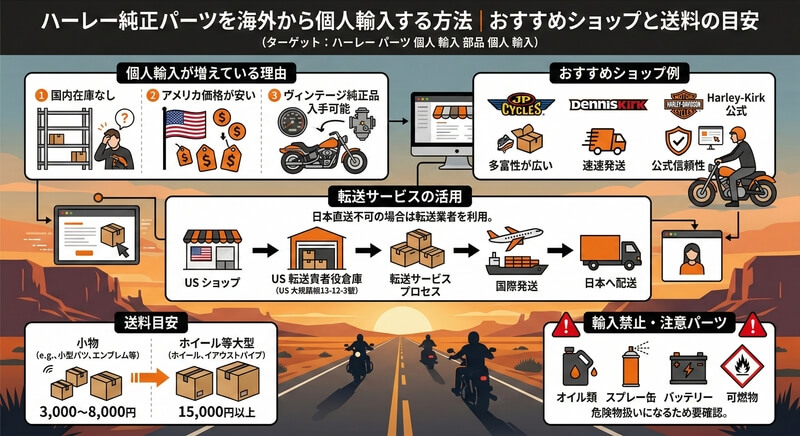 この記事では、ハーレー純正パーツを海外から個人輸入するための具体的なステップ、信頼できるおすすめショップ、送料や関税の目安、そしてトラブルを回避するための注意点までを網羅的に解説します。これを読めば、あなたも「部品 個人 輸入」のスキルを身につけ、より自由にハーレーライフを楽しめるようになるはずです。
