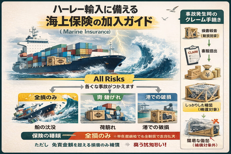 だからこそ、貨物の所有者である輸入者自身が、車両の価値に見合った海上保険を手配する必要があります。ハーレーのような重量があり、かつ外装の傷が価値を大きく下げる貨物において、海上保険への加入は「任意」ではなく「必須」の自己防衛策だと言えます。