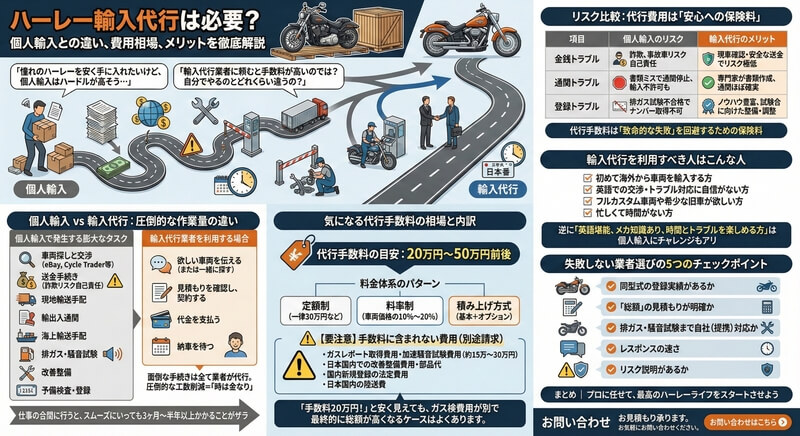 安心と時間を買い、届いたその日から最高の状態でハーレーライフを楽しむ。そのための投資として、輸入代行を賢く利用してみてはいかがでしょうか。
