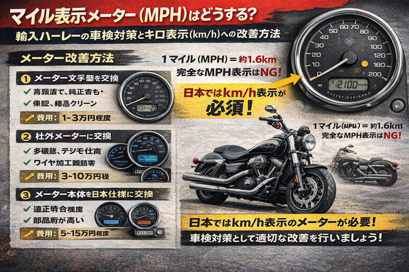 アメリカからハーレーを輸入して日本の公道を走らせるためには、マイル表示(MPH)のスピードメーター対策が避けて通れません。