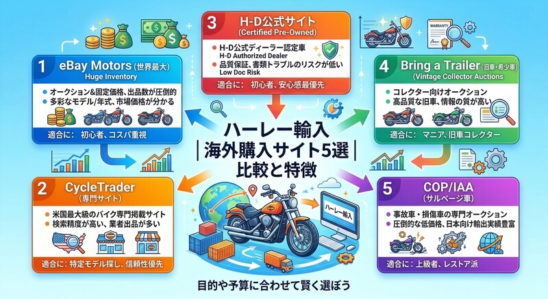「ハーレーを海外から直接買いたいけど、どのサイトを使えばいいの?」「eBay以外にも購入できる場所はある?」——ハーレーの個人輸入・並行輸入を検討している方から、こういった質問が非常に多く寄せられます。