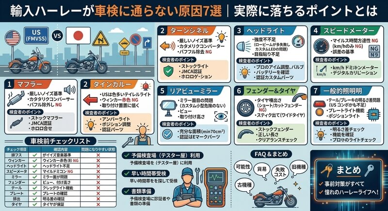 ハーレー輸入車が車検に通らない原因7つを、現場感を交えて解説しました。重要なポイントをおさらいします。