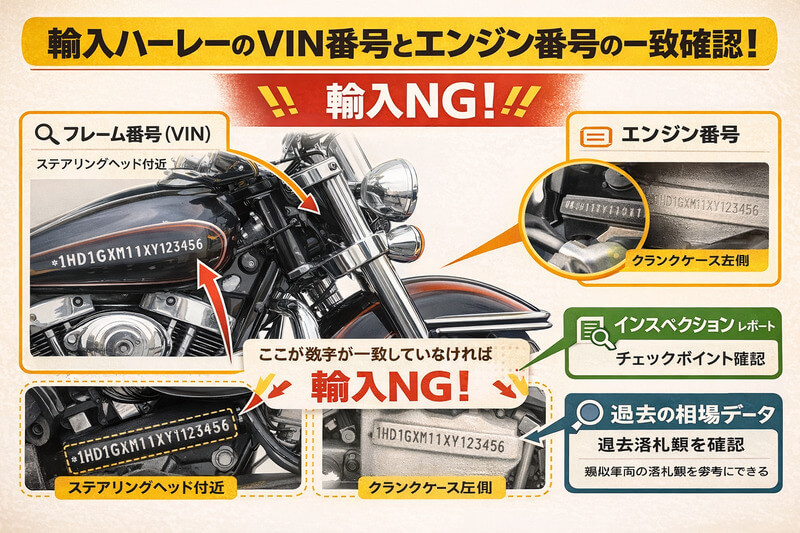 アメリカからハーレーダビッドソンを個人輸入する際、車両のコンディションや価格ばかりに目が行きがちです。しかし、輸入手続きや日本での登録において最も重要となるのが、フレーム番号(VIN)とエンジン番号の確認です。